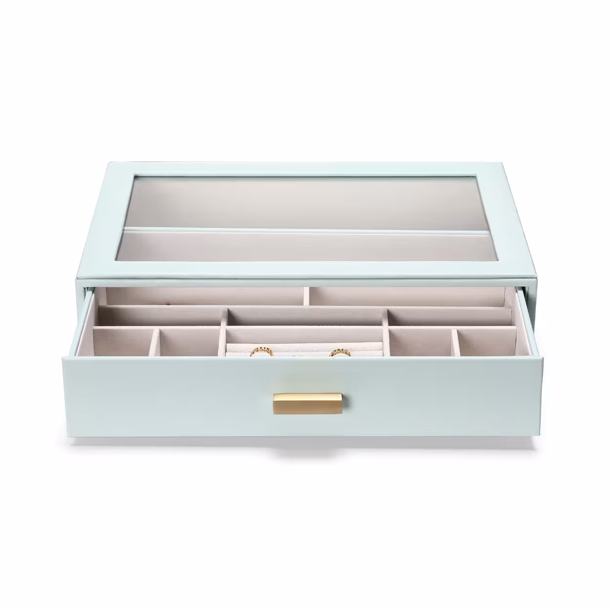 This aqua color jewelry box is designed to bring ease and clarity to the moments you get ready, keeping your pieces visible, protected, and within reach so your routine feels calm, intentional, and effortless.